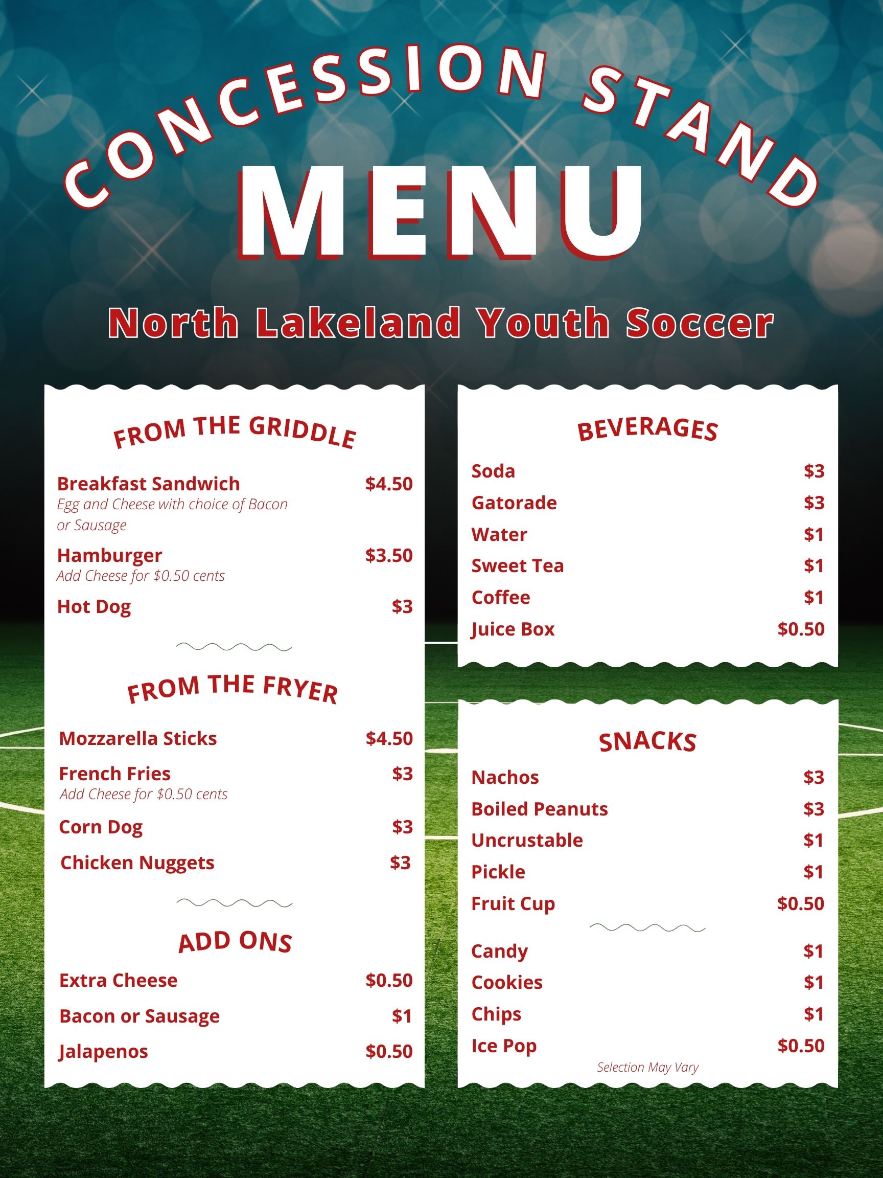 North Lakeland Youth Soccer offers a variety of food and drinks that are available during every game of our Recreational Seasons and during Select Competitive Lakeland Premier FC games played at Hunt Fountain Park (7036 Green Road).